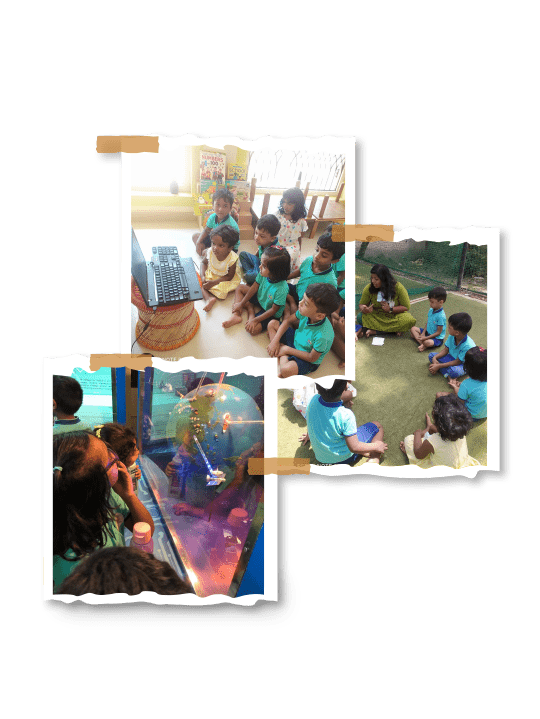 • There are no standardized tests but continuous evaluation and assessments. Children are encouraged to be part of Projects, Games, Group discussions and Presentations to showcase their understanding of the core concepts, and demonstrate its application.